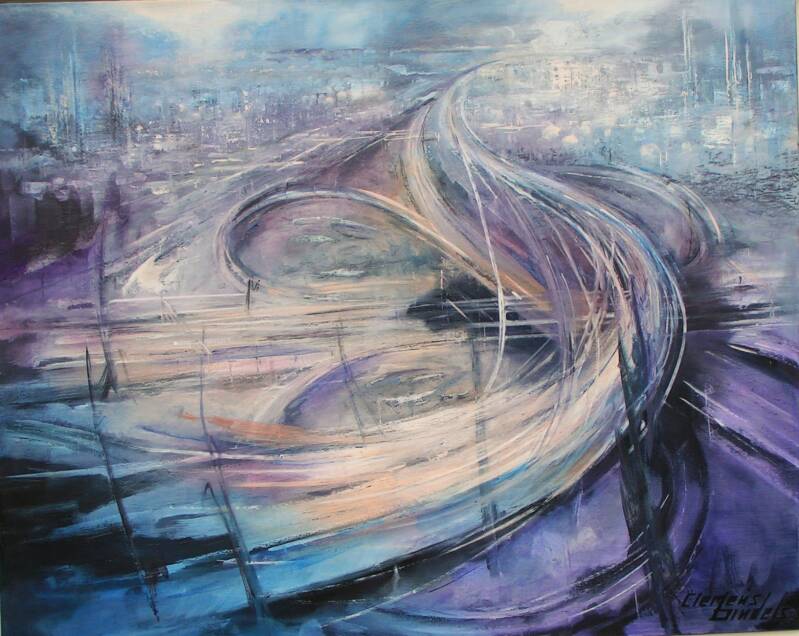 nr. 139 100 x 80 cm. h. olieverf op linnen "DYNAMIEK in witte baklijst'