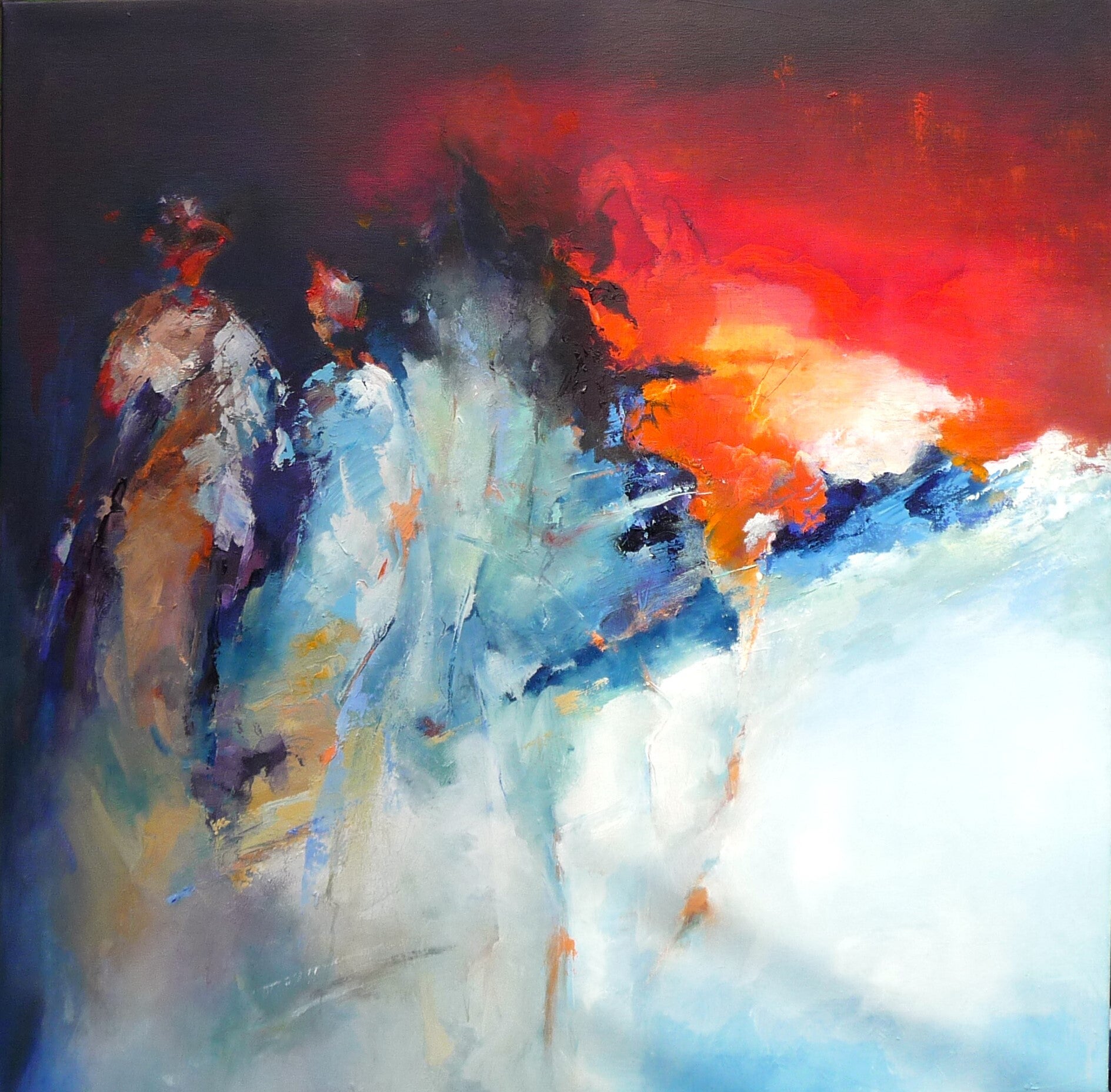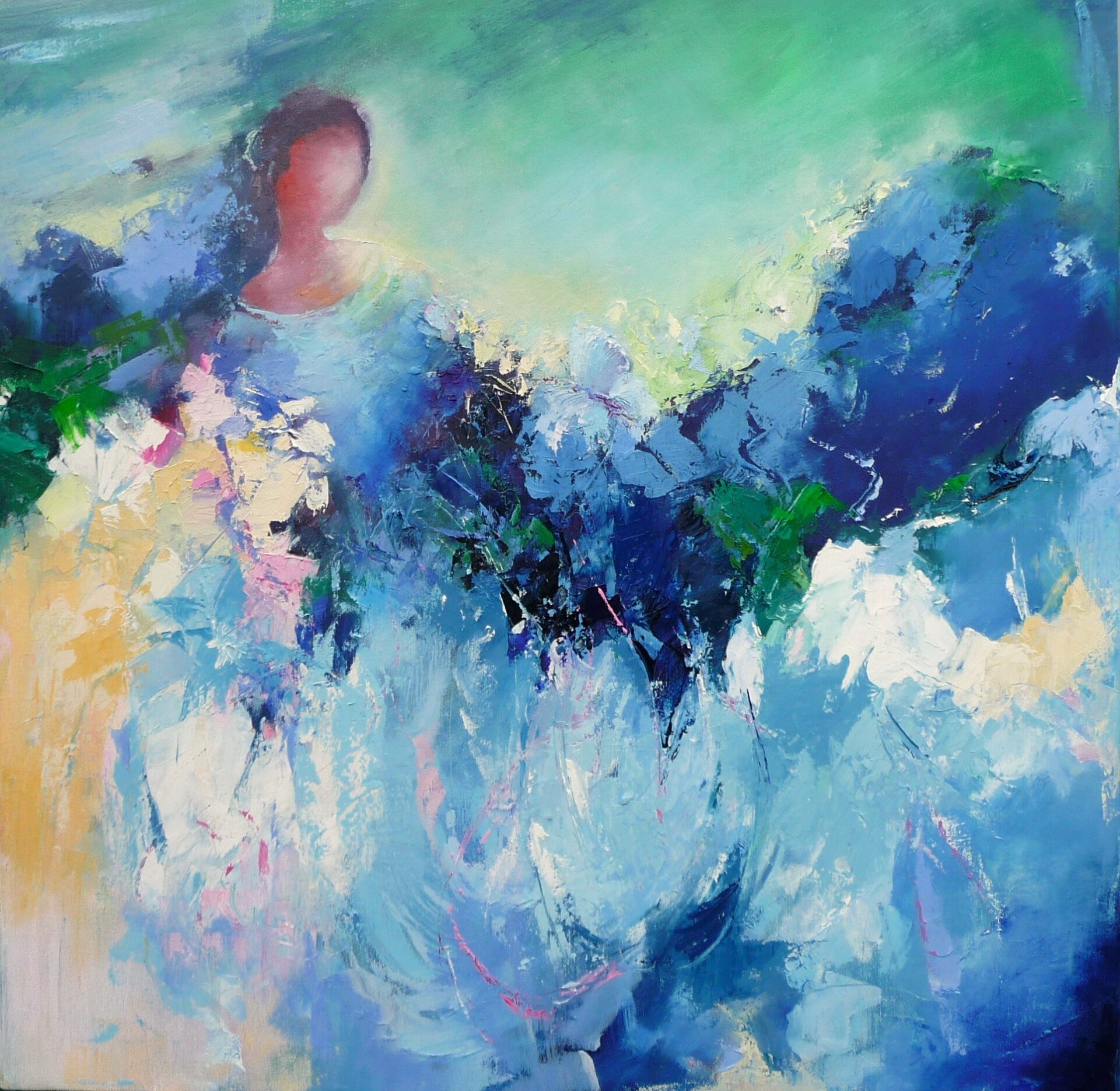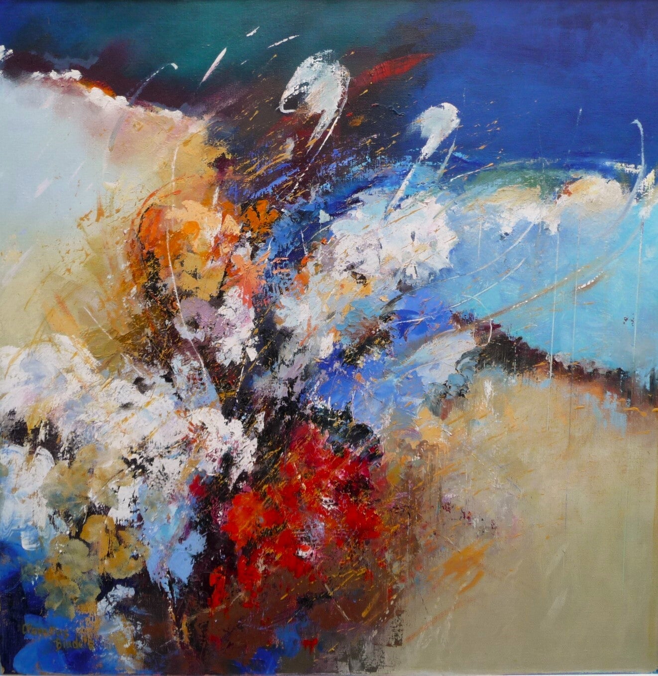 nr. 139 100 x 80 cm. h. olieverf op linnen "DYNAMIEK in witte baklijst'